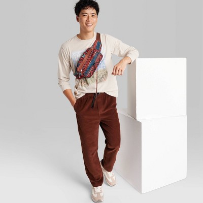 Celana corduroy warna merah bata seperti ini agak susah untuk kombinasi warna. Anda bisa menggunakan warna cream muda seperti gambar di atas atau kaos warna hitam dan putih. Anda juga bisa menggunakan sepatu dengan warna yang sesuai atau warna yang lebih umum seperti putih dan hitam.
